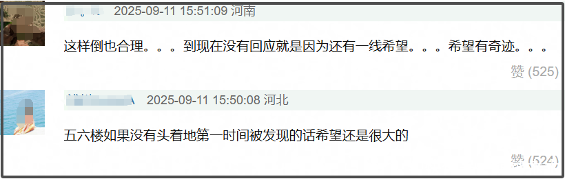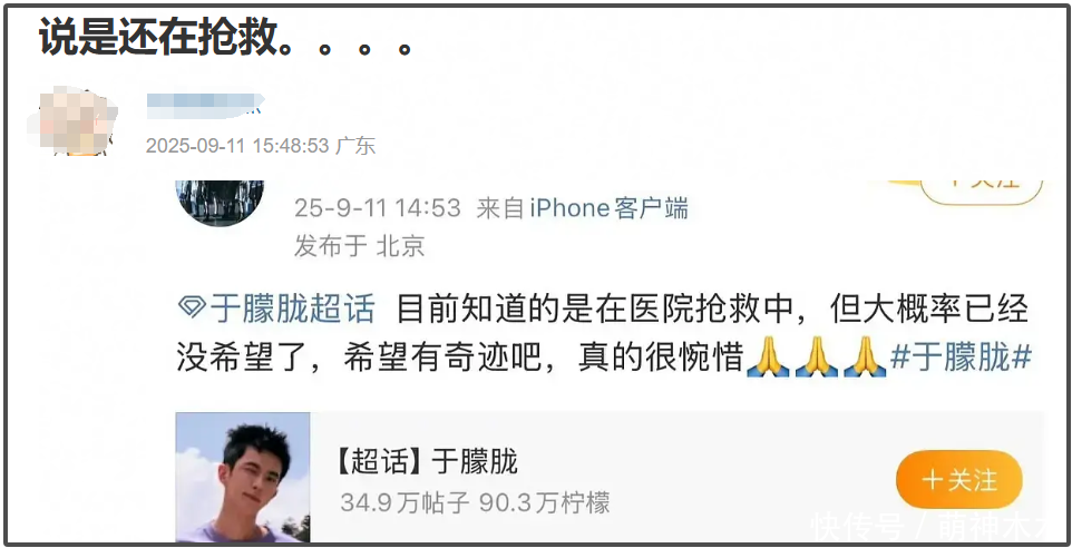 这时候突然传来于朦胧还在抢救的消息,尽管同样未经确认,爆料人都直言属于小道传闻,大家还是第一时间选择相信,毕竟比起一个年仅37岁的明星突然坠楼身亡,更多人希望看到生命奇迹。