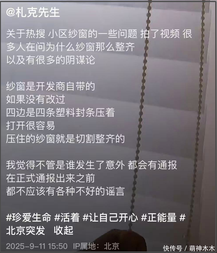 包括出事小区现场照片,也有人曝光了出来,确实可以看到纱窗损坏。