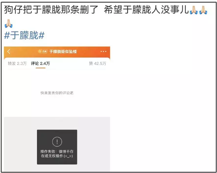 爆料于朦胧坠楼身亡的狗仔删博了!与此同时,疑似小区住户出面爆料,表示于朦胧还在抢救中线上股票配资开户,能等来奇迹吗?