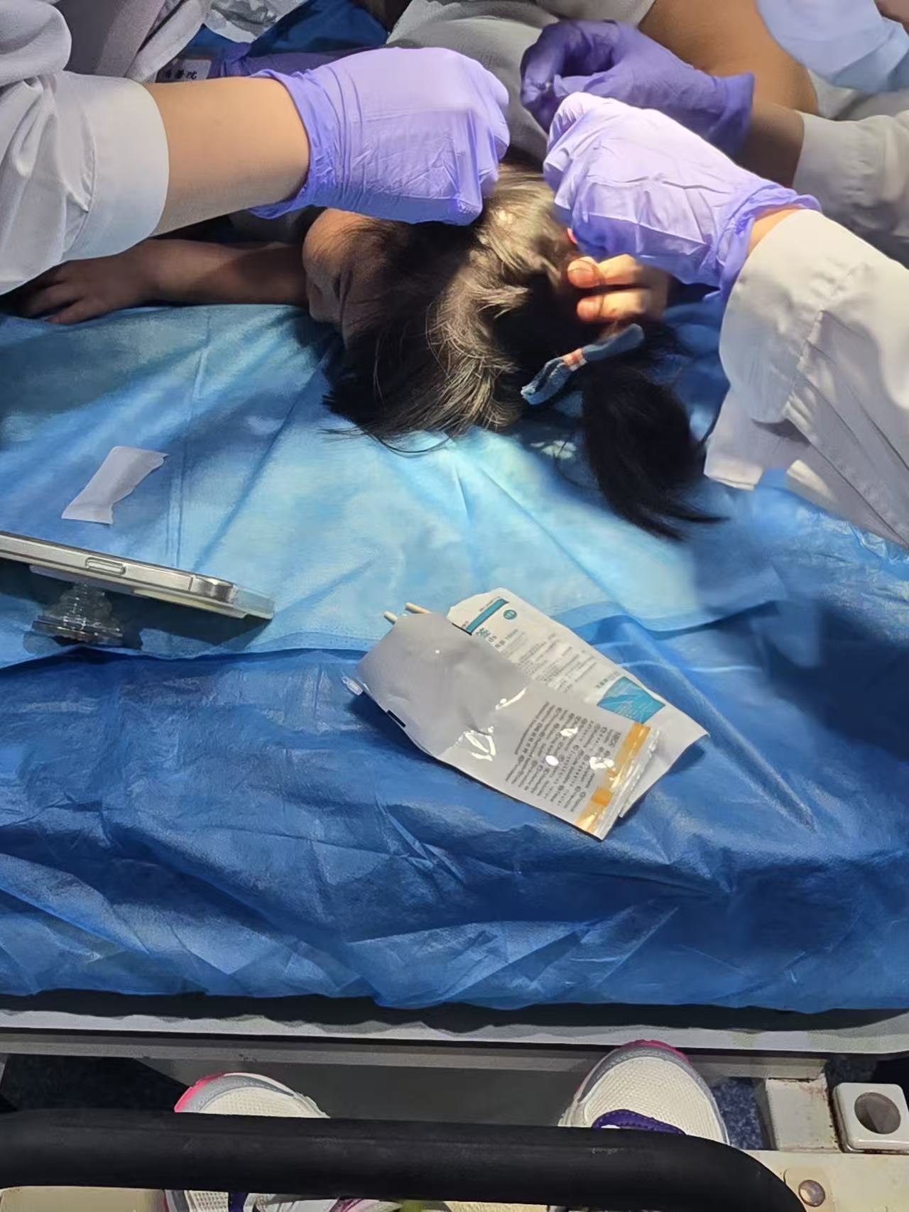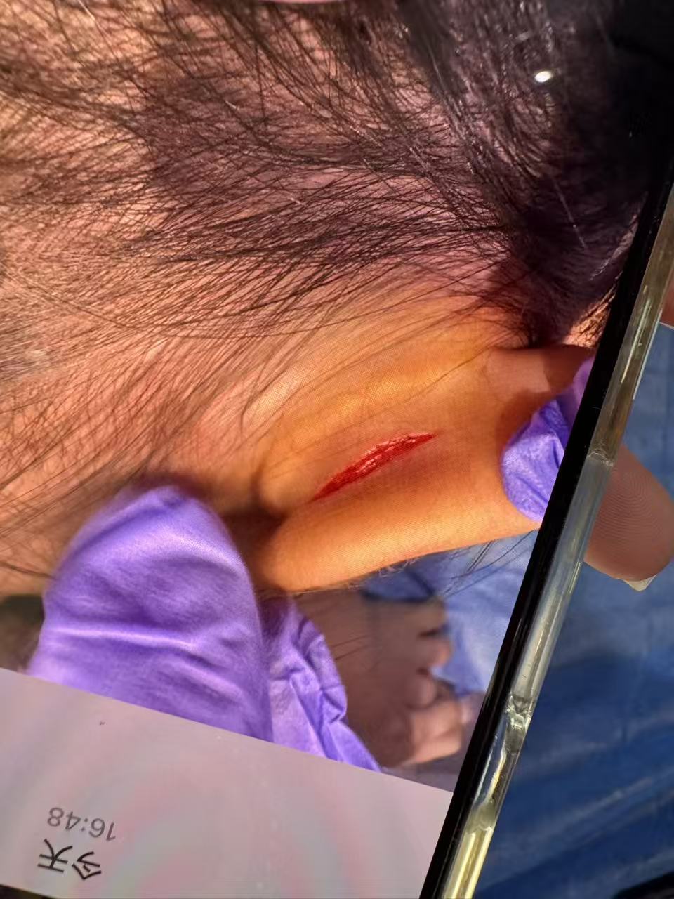一家人未多想,第一时间将孩子送往医院。急诊科医生表示需要使用麻醉,做缝合手术。考虑到孩子年幼,伤口距离大脑太近,家属选择了保守的药物粘合治疗。