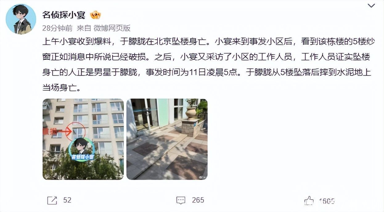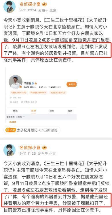 9月11日清晨5点42分,北京朝阳区某高档小区传来一声闷响。遛狗居民发现一名男子倒在血泊中立即报警。物业人员证实,坠楼者正是演员于朦胧——那个总在古装剧里眉眼含笑的翩翩公子。